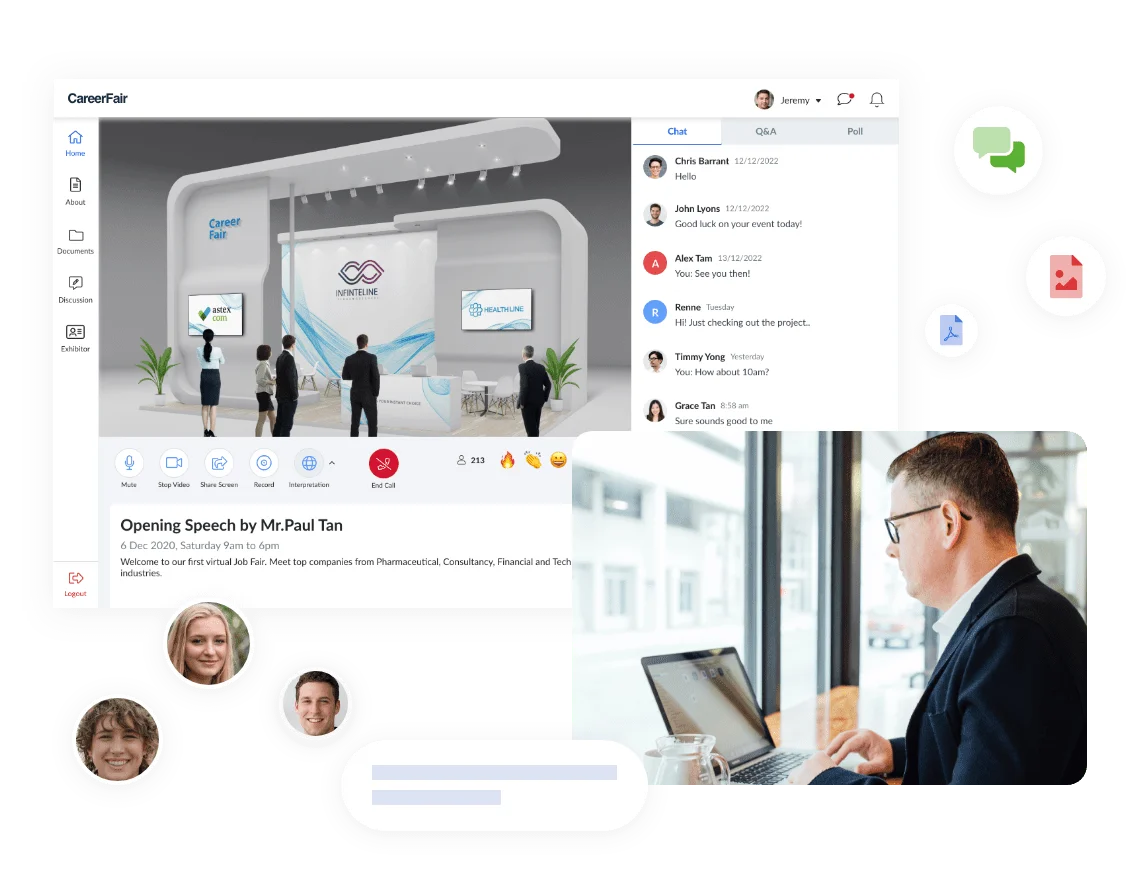 讓贊助商和參展商擁有管理自己的數位展位的能力,包括視頻和相關內容。支持他們通過搜集潛在客戶和1:1視頻通話來進行查詢、會議和示範 – 一切在同一個地方。